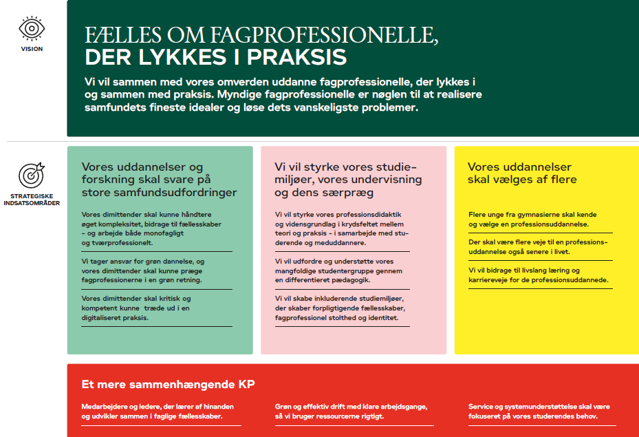 På Københavns Professionshøjskole er vores vision, at vi sammen med vores omverden vil uddanne fagprofessionelle, der lykkes i og sammen med praksis. Myndige fagprofessionelle er nøglen til at realisere samfundets fineste idealer og løse dets vanskeligste problemer.